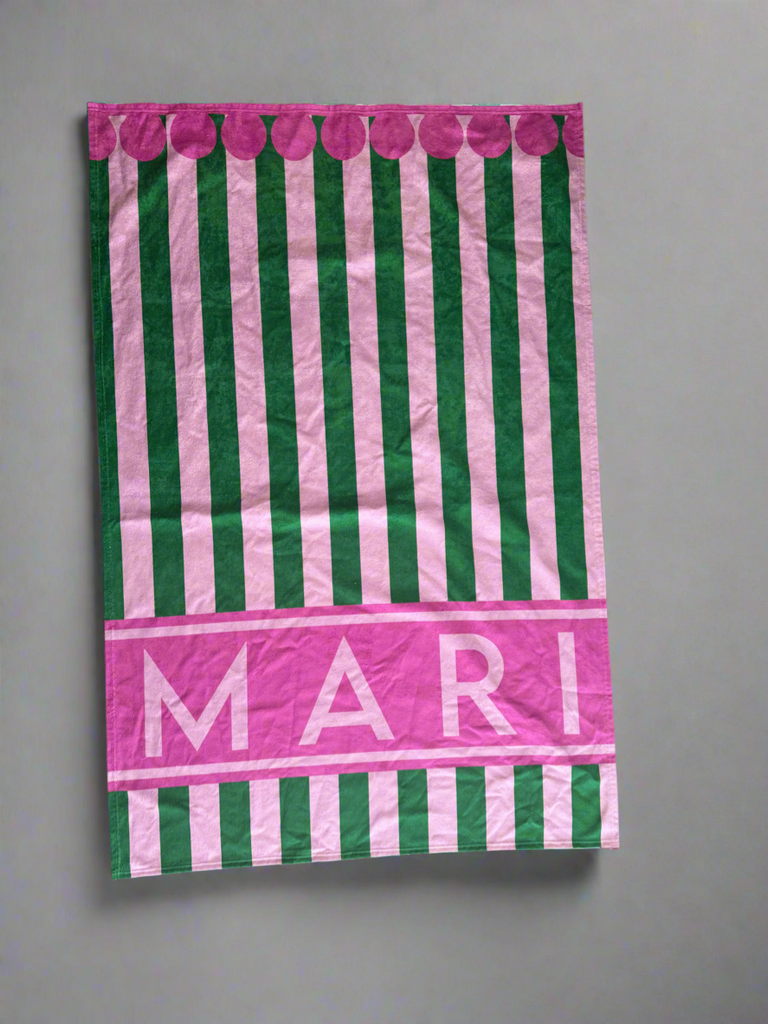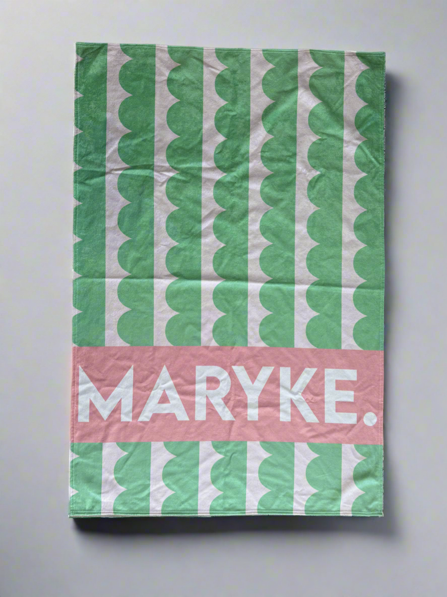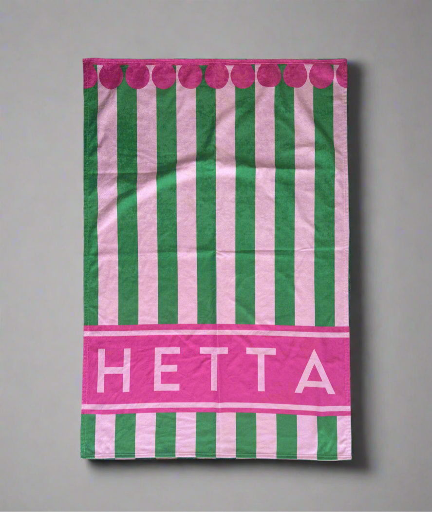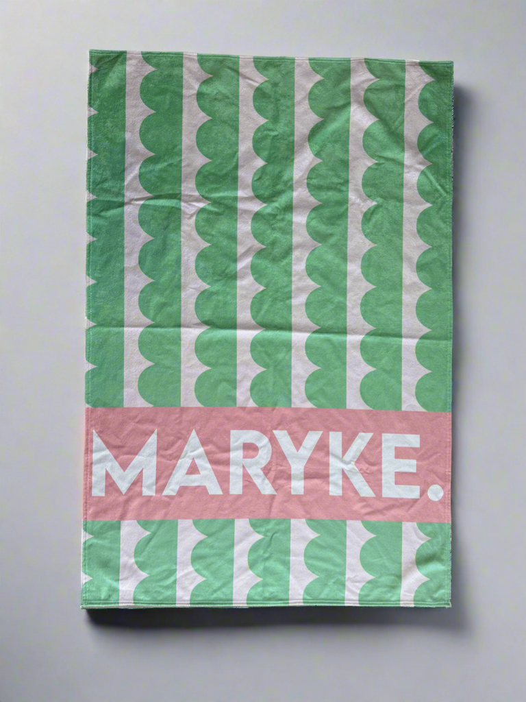 H&G Personalised Microfibre and cotton Towel - Yellow with pink font This item is made on order and lead times of up to 5 weeks may apply. We will however always send your products as soon as it is ready.